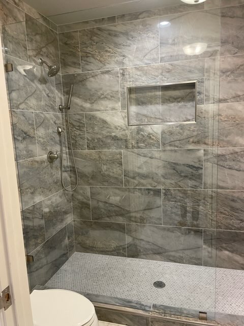 The completed walk-in shower features large-format gray marble-look porcelain tile, frameless glass enclosure, and recessed niche