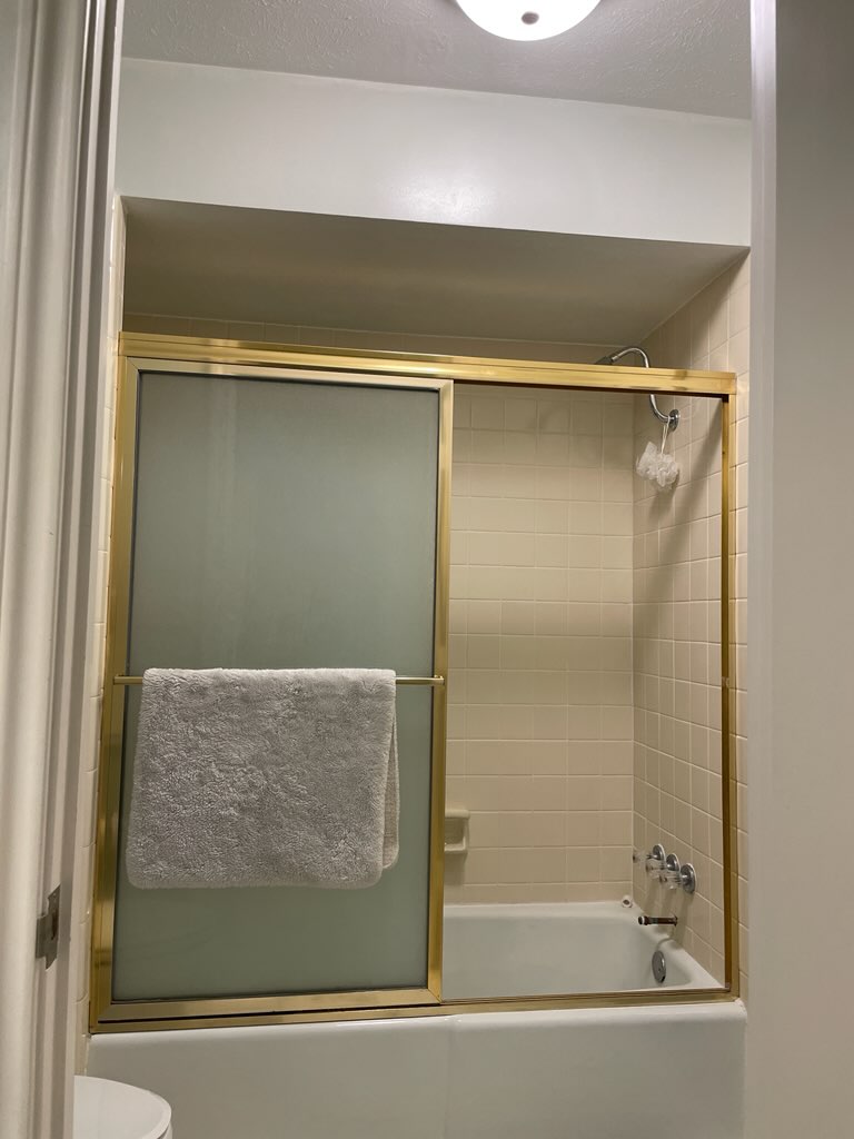 The original bathroom featured dated brass fixtures, a sliding shower door, and beige tile that had seen better days